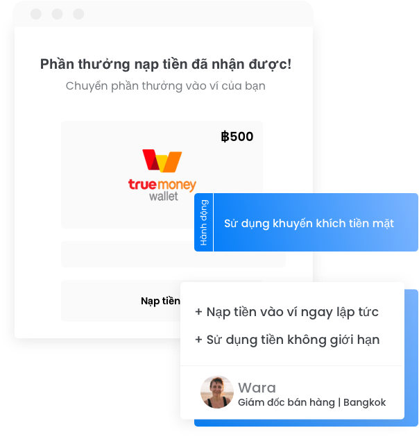 Tiền được nạp vào ví điện tử một cách linh hoạt và gửi đi dưới dạng phần thưởng. Nạp tiền trực tiếp vào tài khoản cá nhân thông qua ứng dụng ví điện tử ewallet